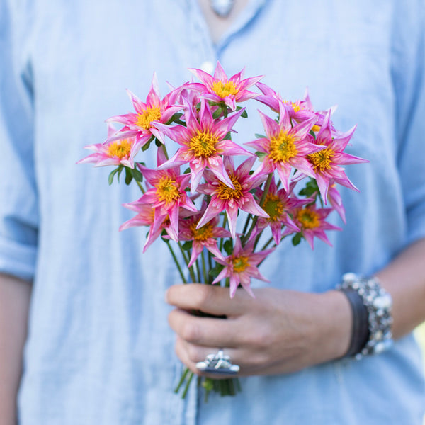 This darling variety has the sweetest miniature, bubblegum-pink, star-shaped flowers on long, wiry stems. Petal tips roll inward, and a ring of short, raised twizzles encircles the golden center. This one is absolutely adorable and like nothing else out there!