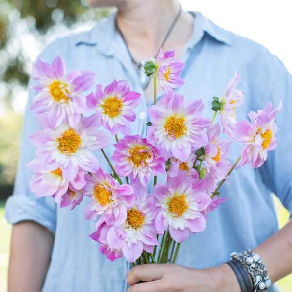 These tall plants produce a bumper crop of outward-facing, long-stemmed blooms. The soft mauve petals have pointed tips and a ring of shorter white twizzles around the golden center.